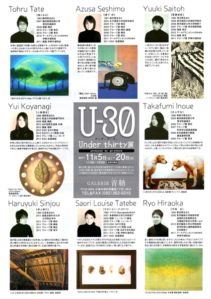 U-30展***GALERIE青鞜***開催中 会期:会期:11月5日(土)~11月20日(日) 11:00~18:00 金・土のみ11:00~20:00 会期中無休 会場:GALERIE青鞜 〒732-0804 広島市南区西蟹屋1-1-46-2 ℡・Fax:082-262-5210 出品作家 井上宇史・小柳優衣・齋藤悠紀・Saori Louise Tatebe・神上晴行・瀬下梓・平岡良・楯とおる 若手の作家8人による展示会です。 ************************* 昨日の夜、12時過ぎに無事に広島より帰宅いたしました(´∀`) 広島の感想はモノ凄く濃い思い出ができましたwww 広島に到着して最初に目に付いたものは路面電車 ![]() 街中をたくさん通っております ![]() 路面電車のある風景ステキですね 残念ながら今回は乗車する機会はなく、いいなぁ、と眺めているのみでした(´Д`)次の機会にはチャレンジしたいです![]() 展示風景 今回の飾りつけはGALERIE青踏さん関係者の方々が行ってくださいました![]() ありがとうございました そしていろいろとご迷惑おかけした事、申し訳ありません![]() おかげさまでとてもステキな空間になっております(*´∀`*) 二階と一階に展示空間があるのでとても広いです ![]() こちらは作家8人とオーナーの集合写真^^ 手前左がGALERIE青踏のオーナー、オブジェさん ![]() とても物静かでどっしりとした感じですwww * ゚・*:.。.:*・゜+ (*´∀`) うそです +.:*・゜゚・*:. * 看板娘のオブジェちゃんです。 みんなに愛されてます ![]() ![]() 奥からプロデューサー與倉 豪さん、オーナー:オブジェさん、 作家:小柳 優衣さん^^ GALERIE青踏さんの奥にはこんなステキなカウンターまであります ![]() 二泊三日でしたがとても短かったような、充実していたので長かったような時間を過ごしてきました ![]() 5日の14時ごろには「FMはつかいち」に電話で出たり、、、w ちゃんと話せていたのか不安です、、、、wwwとても汗かきました ![]() とても貴重な経験が出来ました(*´∀`*)関係者様ありがとうございます ![]() 広島にはまた行きたいです お好み焼きうまいです 展示は20日までやっております![]() 多くの方にご来場いただければ幸いです ![]() 来年来るときはもっと良い絵を描いていると思うので楽しみにしてもらえたらなぁ、と思います ![]() そのためにも展示中の作品に頑張ってもらわねば ![]() 神奈川から広島に気を送っておきます ![]() お近くにお越しの際はぜひお立ち寄りください ![]() 2011.10.28 Fri 22:28:18 DMできました^^今後の展示のDMができました^^ U-30展***GALERIE青鞜*** 会期:会期:11月5日(土)~11月20日(日) 11:00~18:00 金・土のみ11:00~20:00 会期中無休 会場:GALERIE青鞜 〒732-0804 広島市南区西蟹屋1-1-46-2 ℡・Fax:082-262-5210 出品作家 井上宇史・小柳優衣・齋藤悠紀・Saori Louise Tatebe・神上晴行・瀬下梓・平岡良・楯とおる 若手の作家8人による展示会です。 今回のフライヤーはA4サイズでなんかかっこいいです ![]() 私は左上に載っております このフライヤーは広島中心で配るため普段案内状を出させていただいている方にもお配りしておりません。すいません![]() 私も広島に5日、6日、7日は行ってきます 広島は修学旅行以来なので楽しみです![]() もう一つできました^^ 会期:2011.11/28~2012.01/21 会場:t.y.harbor brewery 〒140-0002 東京都品川区東品川2-1-3 倉庫を改装した品川にあるレストランです^^ めちゃくちゃオシャレ空間です ![]() 営業時間: lunch11:30-14:00L○(mon-fri) lunch11:30-15:00L○(sat/sun/hol) dinner17:30-22:00L○(21:00L○ sun/hol) bar 17:00-22:30L○(21:30L○ sun/hol) 場所など詳しい情報はこちらをご覧ください →http://www.tyharborbrewing.co.jp/jp/ty-harbor とても人気のレストランですので貸切日などもございます。お越しの際は電話にて営業時間の確認や予約をお勧めいたします ![]() お店は運河に面しておりとてもステキな景色が眺められます ![]() 今回の展示は年末から年明けまでの大事な時の展示となっております ![]() おいしい料理と絵で少しでも良い時間を過ごしていただければと思います ![]() 展示のタイトルは「喜び」といたしました ![]() この喜びは生きる、生きているということの喜びです。 ニュースを見ていてそんな単純な原点にもう一度、返ってみることが大切なのではないかと思いこのタイトルにいたしました。 このDMは皆様に近々送らせていただきますので楽しみにしていただければと思います ![]() 鎌倉現代展の案内状もお楽しみに ![]() ![]() ![]() 2011.10.16 Sun 00:41:51 小柳さん個展小柳 優衣 銅版画小作品展 腐食の形跡