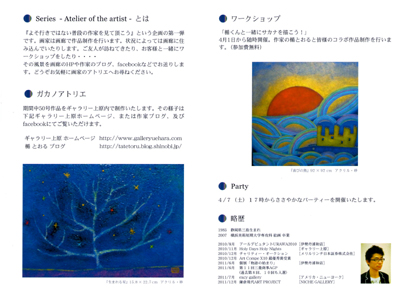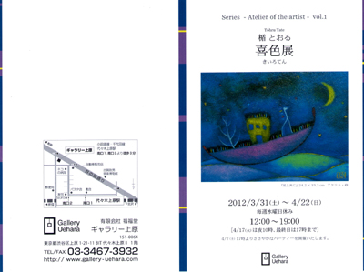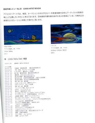 2012.1.30.コーポラティブハウスで展示されました☆ 2012.01.23 Mon 02:59:45 (人´∀`).☆.。.:*・゚2012.01.22.T.Y.HarborBrewery搬出☆ T.Y.HarborBrewery「喜び」展無事に終了^^今日は搬出をしてきました。 搬出の際も搬入同様に担当者有元様、スタッフの方に手伝っていただきました ありがとうございます^^(画像の左側)アトリエ・モネ・田代様にもいろいろと手伝っていただきました☆ありがとうございます。 家に着いたのは夜の12時過ぎ おかげさまで無事に搬出を終えました^^今回の展示は2011年11月28日~2012年1月22日までという二ヶ月間の長期に亘る展示でした。おかげさまで多くの方にご高覧いただけました、ありがとうございます ご来場くださいました皆様、本当にありがとうございます^^T.Y.HarborBreweryのスタッフの皆様、いろいろとありがとうございました☆今回は会場には居れませんでしたが展示はとても好評だったようです 良かった♪展示の前は他の展示と重なったこともあり、プレッシャーで潰れそうな日もありましたwwwでも、それが良い結果に繋がったのだと思います![]() また、展示できたらいいなぁ、と思っております T.Y.HarborBreweryではT.Y.Artworx として、才能あるアーティストがもっと気軽に作品を発表でき、もっと幅広い人たちの目に作品が触れる機会を創ることで、彼らの活動を支援しようというプログラムを行っております。楯の展示は終了いたしましたが、明日からは作家:手嶋 智美さんの展示が行われます。ステキな作品が楽しめて料理もおいしく、お店の雰囲気も格別です^^お近くにお越しの際はお立ち寄りください☆T.Y.HarborBrewery↓ http://www.tyharborbrewing.co.jp/jp/ty-harbor T.Y.Artworx(展示作家を募集してますよ)↓ http://www.tyharborbrewing.co.jp/jp/ty-harbor/about/artworx ※作家さんへ:私は紹介していただいたので公募の内容はわかりませんが、私は展示でステキな出会いをいただきました。お勧めですよ ![]() 韓国国際美術際のパンフレットが届きました 展示はすでに終了しております![]() 韓国国際美術際には日本以外からもカナダ、アメリカ、中国、台湾、ウズベキスタン、インド、タジキスタン、トルコ、アルメニアなどから作家が参加していたようです。展示には行けなかったのが残念です ![]() 画像の左ページ、中央に載ってます ![]() 報告が遅くなってしまいました。すいません ![]() 最近は勉強継続中です ![]() 1月28日~29日のコーポラティブハウスのオープンではうれしい予定の変更があり、6点ほど展示するものと思います HP、facebookで画像をアップするので楽しみにしていただければと思います![]() では、でわ、とてつもなく寒くなってきましたので皆様、風邪などにはお気をつけてくださいね ![]() 2012.01.12 Thu 04:01:15 wa-i2011.1.12.うれしいご報告です♪ 2012.1/28~1/29.コーポラティブハウス・プロジェクト・オープンハウス にて作品を展示していただけます 新築の家に展示させていただきます☆会期:会期:1月28日~1月29日(日) 会場:オープンハウス コーポラティブハウスとは建築家と相談しながら建てる集合住宅 そのプロジェクトが、今月半ばに完成し、1/28(土)~1/29(日)にオープンハウスを行う予定です。オープンハウスでは、来場者の方に暮らしのイメージを持っていただくために家具やグリーンを置いたり、絵を飾ったりするのですが、そこで楯の作品も飾らせていただく予定です 一点のみですが1830×300(㎜)の横長の作品を展示する予定となっております![]() 只今、製作中 ![]() プロジェクトサイト→http://www.archinet.co.jp/s/cooperativehouse_whatis.html 竣工例からステキなお部屋が見れます^^ 展示風景などはblog,facebookでアップします 申し訳ございませんが今回は普段の展示とは異なりますので案内状などはございません。もう一つ、ご報告を ![]() 2012.2/25.第20回「ISEアートカタログ表紙作家」選出!! 第20回「ISEアートカタログ表紙作家」選出されました^^当日はオークション会場でオークションとは別に会場で作品の展示、販売をしております。オークションへの参加、カタログの購入は下記をご覧ください ![]() 第20回「ISEアートオークション」 会期:2月25日(土) 会場:〒105-0004 東京都港区新橋5-14-10新橋スクエアビル3階 ※ISEアートカタログ表紙作家なのでオークションには参加しておりませんが作品の展示、販売はしております。 ISEアートオークション→http://www.ise-art.co.jp/ アイエスイーアートでは、毎回、オークションカタログのカバーを新進気鋭の日本人アーティストの発表の場として公開していただいてます。今回は楯を選出していただきました 日本美術の礎を築きあげた先人の芸術と「いま」の時代との表現のコラボーションを感じて頂ければ幸いです。カタログは3000円でお求めいただけます^^ 楯の作品は表紙と中の見開きに載っております♪ カタログをお求めの方はこちらへ→カタログ 「交通ご案内」 新橋駅から 汐留口 第一京浜沿い 徒歩7分 烏森口 日陰町通り沿い 徒歩7分 都営三田線から 御成門駅 徒歩7分 〒105-0004 東京都港区新橋5-14-10新橋