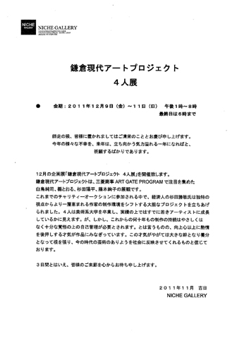 blogNINJAPAGE | 1 2 3 4 5 6 7 8 9 | ADMIN | WRITE 2011.11.28 Mon 18:35:18 t.y.harbor breweryに搬入してきました^^2011.11.27.T.Y.Harbor Breweryに搬入してきました☆ 会期:2011.11/28~2012.01/21 会場:t.y.harbor brewery 〒140-0002 東京都品川区東品川2-1-3 倉庫を改装した品川にあるレストランです^^ めちゃくちゃオシャレ空間です ![]() 営業時間: lunch11:30-14:00L○(mon-fri) lunch11:30-15:00L○(sat/sun/hol) dinner17:30-22:00L○(21:00L○ sun/hol) bar 17:00-22:30L○(21:30L○ sun/hol) 場所など詳しい情報はこちらをご覧ください →http://www.tyharborbrewing.co.jp/jp/ty-harbor とても人気のレストランですので貸切日などもございます。お越しの際は電話にて営業時間の確認や予約をお勧めいたします ![]() お店は運河に面しておりとてもステキな景色が眺められます ![]() こちらは搬入風景^^夜の22:30頃からの搬入でした ![]() 作業は夜の12時までかかりました お手伝いいただきましたアトリエモネ様、担当者有元様、スタッフの方、おかげさまでスムーズに飾りつけが行えました。本当にありがとうございました![]() 結局、終電を逃してしまい五反田で一夜を過ごしましたwww 今回の展示は年末から年明けまでの大事な時の展示となっております ![]() おいしい料理と絵で少しでも良い時間を過ごしていただければと思います ![]() お近くにお越しの際はぜひ、お立ち寄りください ![]() 鎌倉現代の準備も着々と進めております ![]() 詳しくはこちらをhttp://tatetoru.blog.shinobi.jp/Date/20111123/ 楯 とおる HP http://tatetoru.garyoutensei.com/ PR 2011.11.23 Wed 22:21:25 鎌倉現代ART PROJECT 始動!!☆2011.11.23.ついに12月9日(金)~12月11日(日)銀座での展示 「鎌倉現代ART PROJECT」のDMが出来ました ![]() 「鎌倉現代ART PROJECT」 作家:白鳥 純司 楯 とおる 杉田 陽平 藤本 絢子 (順番はDM記載順) 会期:2011年12月09日(金).~12月11日(日) 会期時間;13:00~20:00 最終日11日は18:00まで 会場:NICHE GALLERY 〒104-0061 東京都中央区銀座3-3-12 銀座ビルディング3F 03-5250-1006 NICHE GALLRY http://nichegallery.jp/ 今回の展示は今の美術業界を生き抜く猛者ばかり 新進気鋭とはこの人たちのためにあり、、、、、って自分で言うな( ´∀`)つ)Д`)と、つっこまれそうですが、、、w しかし、それぐらいの3人です!!もとい、4人です(自分も含め)!! この展示はいろんな意味で一味違うのです 美術業界の方必見です![]() なぜかは企画者のあいさつ文より引用させていただきます 下記より。挨拶文より抜粋 ~しかし、作家との交流を通じてきびしい現実も知りました。 美術学校では、どうやって描くかを学びます。どうやって売るのか、どうしたら自立できるのか誰も知りません。日本人のどこかに芸術は崇高なもの、商売(お金)は下品なものという刷り込みがあるのではないか。世間では銀行や商社が就職人気の上位を占めるのに、美術界はお金や商売のはなしはタブーなのか~ ~世の大半の方は、美術館に行っても画廊に入ったことはなく、作家の知り合いもおりません。先に社会で活躍している方々が、少しだけ作家に触れてみてほしいのです。作家は常識がなく、腹がたつことも多いですが、実に純粋で清々しいのです。こんなに愉快でおもしろいことを、一人でも多くの方に体験してほしいと願い、展覧会をおもいつきました。 当日はすべての作家が在廊し、皆様との交流を楽しみにお待ちしております。お気軽にお越しいただければ幸いです。 鎌倉現代 仕掛け人 杉田 勝敏 (挨拶文抜粋ここまで) 今回の展示は作家が問われ、美術関係者(美術間、galleryなど)や美術愛好家も作家との、作品との関係を問われているのではないかと思います。 日本はガラパゴスと例えられますが経済や携帯の世界だけでなく、日本の底力が試されているのは 美術業界でも同じなのです。作家は社会に何が出来るのかを問われ、社会とどう関わっていくのかを問われている時なのではないでしょうか? 私としては問われたからには答えを見つけに行くしかありません━━━━ヽ(´∀`ヽ)━━━━━!!!! 作家と作品、作家と社会、各々の関係があるのはわかっていますが自分はどうなのかを確かめに行くしかありません!! アートソムリエ山本冬彦さんのblogでも紹介していただいてます。 http://ameblo.jp/0761226555/entry-11086354061.html 勝手にリンクさせていただきました。(コメントが送れなかったもので。) ぜひぜひ、楽しみしていただければと思います ![]() そうそう、T.Y.Harbor BreweryのDM発送いたしました・:*:・(*´∀`*)・:*:・こちらは在廊しておりませんのであしからずご了承ください。 会期:2011.11/28~2012.01/21 会場:t.y.harbor brewery 〒140-0002 東京都品川区東品川2-1-3 倉庫を改装した品川にあるレストランです^^ めちゃくちゃオシャレ空間です ![]() 営業時間: lunch11:30-14:00L○(mon-fri) lunch11:30-15:00L○(sat/sun/hol) dinner17:30-22:00L○(21:00L○ sun/hol) bar 17:00-22:30L○(21:30L○ sun/hol) 場所など詳しい情報はこちらをご覧ください http://www.tyharborbrewing.co.jp/jp/ty-harbor tate tohru→http://tatetoru.garyoutensei.com/ 2011.11.16 Wed 04:30:24 同年代作家制作の合間の息抜き・:*:・(*´∀`*)・:*:・ 先日、築地に行